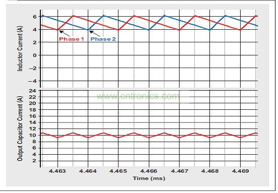 圖4 顯示了25% 占空比下一個二相降壓轉(zhuǎn)換器的仿真結(jié)果。電感紋波電流為2.2A,但是輸出電容器電流僅為1.5A,原因是紋波電流抵消。50% 占空比下使用二相時,電容器完全沒有紋波電流。