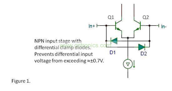 許多運算放大器都在輸入端之間有電壓鉗位,其大多數(shù)一般都使用背靠背二極管(有時使用兩個或者更多的串聯(lián)二極管)來實施。這些二極管保護(hù)輸入晶體管免受其基極結(jié)點反向擊穿的損害。差動輸入為約6V 時便會出現(xiàn)許多IC 工藝擊穿,這會極大地改變或者損壞晶體管。下圖顯示了NPN 輸入級,D1 和D2 提供了這種保護(hù)功能。