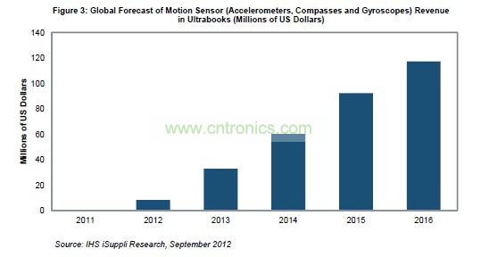 在超級本的帶動下,包括加速計、陀螺儀和羅盤在內(nèi)的運(yùn)動傳感器的全球銷售額到2016年將達(dá)到1.173億美元,而2012年只有830萬美元,2012-2016年的復(fù)合年度增長率高達(dá)93.9%,如圖所示。