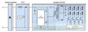 圖 5 以 PFC 輸入級(jí)和 LLC 拓?fù)湔故玖烁邏候?qū)動(dòng)器概念。 PFC/LLC 結(jié)合最高可產(chǎn)生 92% 的效率。 對(duì)于一個(gè) 400W 的 LED 驅(qū)動(dòng)器,意味著 32 W 的熱損耗。