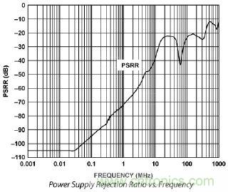 電源抑制(PSR)測(cè)量電源紋波如何與ADC輸入耦合,顯現(xiàn)在其數(shù)字輸出上。如果PSR有限,相對(duì)于輸入電平,電源線(xiàn)上的噪聲將僅會(huì)受到30至50 dB的抑制。