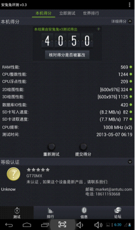 AnTuTu Benchmark是一個專門給Android設(shè)備的手機(jī)、平板電腦硬體打分的軟件,,通過“內(nèi)存性能”、“CPU整數(shù)性能”,“CPU浮點性能”、“2D、3D繪圖性能”、“數(shù)據(jù)庫IO”、“SD卡讀、寫速度” 等性能測試對手機(jī)的硬體性能做出評分。