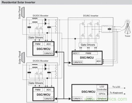 家庭太陽能逆變系統(tǒng)中,飛思卡爾的處理器、微控制器產(chǎn)品,如MC56F84XXX、MC56F82XX、56F803X等等產(chǎn)品,為整個(gè)系統(tǒng)帶來可行、高效、可靠的電源轉(zhuǎn)換方案。