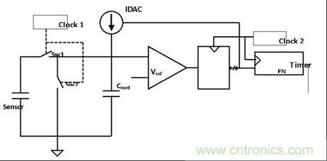 通過(guò)在GND和VREF(內(nèi)部生成)之間切換傳感器,只要在器件規(guī)定的工作范圍內(nèi),電源的任何變化都不會(huì)造成假觸發(fā)。圖2顯示了傳感器電容在集成電容(Cmod)電壓和GND之間用兩個(gè)非重疊時(shí)鐘Sw1和Sw2切換時(shí)的技術(shù)實(shí)施情況。電路比較器的輸出通過(guò)觸發(fā)器作為定時(shí)器的使能信號(hào),并通過(guò)調(diào)節(jié)電源來(lái)確保Cmod電壓與參考電壓(Vref)相同。由于輸入端上的任何信號(hào)都就n個(gè)時(shí)鐘周期求積分(n取決于分辨率),因此耦合到輸入端上的任何高頻噪聲都會(huì)通過(guò)積分效果被平均。