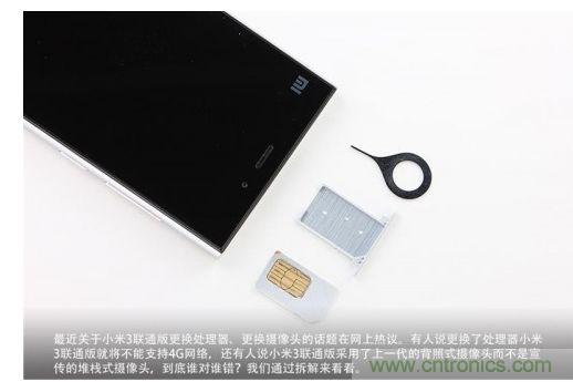 聯(lián)通版小米3在上市之后接連遭遇了更換攝像頭和處理器的風(fēng)波當(dāng)中,有人說(shuō)更換了處理器的小米3就不能支持4G網(wǎng)絡(luò)了,還有人說(shuō)小米3用的是上一代背照式攝像頭而不是宣傳的堆棧式攝像頭,到底這些說(shuō)法正確嗎?我們通過(guò)拆解來(lái)看一看吧。