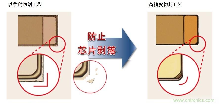 ROHM通過采用與以往不同的、獨(dú)創(chuàng)的微細(xì)化技術(shù),在開發(fā)制造系統(tǒng)的同時,改進(jìn)切割方法,在切割工藝上將封裝尺寸公差大幅降至±10μm。通過提高尺寸精度,消除毛刺和碎片,有助于減少貼裝時的吸著誤差以及提高貼裝精度。