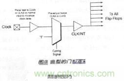 這 是最廣泛使用的方法,即在器件末使用時截斷時鐘來降低功耗。然而正確地截斷時鐘十分重要。門控信號與門控邏輯應(yīng)正確地設(shè)計,以消除時鐘線上的任何毛刺。再 者,門控邏輯會增加時鐘的延時,影響建立時間與保持時間。由于抗熔斷是一種極快速的技術(shù),引入的延時很小且容易控制。在使用時鐘門控時,用戶應(yīng)仔細地安置 門控邏輯,將時鐘網(wǎng)絡(luò)的延時降低到最小限度。典型的門控邏輯如圖3所示。