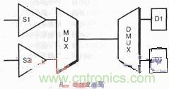 高 密度設(shè)計的布局必須留有空地并相當(dāng)?shù)卣归_,才可完成,這便導(dǎo)致連線長,每個線上開關(guān)多,這些因素產(chǎn)生不良的時序結(jié)果并增加了功耗。此外,塊中的邏輯趨向于 分類集結(jié)在一起,總線跨越不同塊時需走過較長的距離。在一個設(shè)計中采用時分復(fù)用寬總線技術(shù),可減少總線的數(shù)量,有利于時序和功耗。再者,在DSP設(shè)計中, 數(shù)據(jù)是相關(guān)的,這表明大多數(shù)數(shù)據(jù)位并未改變狀態(tài)。攜帶相關(guān)數(shù)據(jù)的總線應(yīng)盡量復(fù)用在一起,進一步減少MUX、DEMUX邏輯中的開關(guān)活動(圖5)。