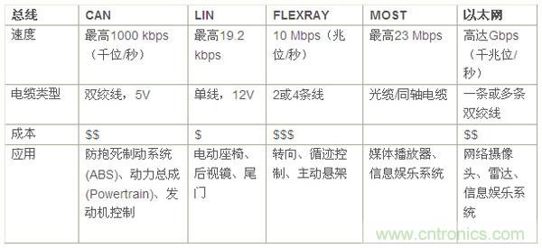一輛典型的現(xiàn)代化汽車將同時(shí)裝配各類總線和協(xié)議并從 LIN、CAN、FlexRay、MOST 和以太網(wǎng)中選擇合適的網(wǎng)絡(luò)。多媒體/視聽信號(hào)和汽車環(huán)繞攝像系統(tǒng)需要更高的數(shù)據(jù)速率,因此汽車制造商和 OEM 廠商在網(wǎng)絡(luò)解決方案上選擇用以太網(wǎng)代替 MOST。但對(duì)于許多標(biāo)準(zhǔn)汽車功能而言,LIN 和 CAN 提供的帶寬與性能就足夠了。