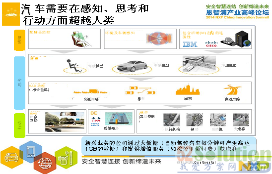 Owen展現(xiàn)智能汽車安全互聯(lián)的美好場景。一個安全互聯(lián)的智能汽車就是未來。車有自己的感知系統(tǒng),在思考和行動方面都超越了人類,它會自動地去決定該行駛的速度,在感知到前面有個物體的時候它會自動停車,或者當(dāng)車感知到前面有交通擁堵的狀況發(fā)生,它會自然而然的慢下速度,而且會保持一個安全距離。在智能汽車的世界里,更多的是采用電子的系統(tǒng),也意味著發(fā)動機的效率也會更加提高。