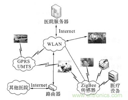 系統(tǒng)中包括無線個人網(wǎng)絡(luò)(wireless person2al area network,WPAN ) 、ZigBee網(wǎng)絡(luò)以及一系列醫(yī)療監(jiān)護(hù)網(wǎng)絡(luò)的醫(yī)療傳感器節(jié)點。本系統(tǒng)具有良好的擴(kuò)展性,例如醫(yī)護(hù)人員在急救途中或在其他醫(yī)院可以分別利用WLAN /UMTS網(wǎng)關(guān)和互聯(lián)網(wǎng)與系統(tǒng)進(jìn)行信息交互。