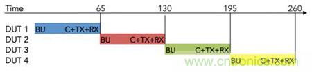 另一種減少測試時間的方法是通過向多個DUT發(fā)送相同的波形來同時執(zhí)行多個RX測試。通過將每個DUT分配到相應(yīng)的軟件線程,所有DUT均可同時啟動。使用如圖5所示的技術(shù),多DUT的測試時間相比流水線測試可減少25%,相比串行測試設(shè)備可減少超過50%。