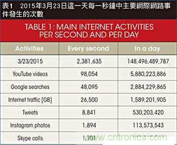 網(wǎng)際網(wǎng)路實(shí)現(xiàn)了廣泛的資料通訊服務(wù),如電子郵件、視訊下載、Google搜索、推特(Twitter)消息發(fā)送、Skype電話等等。表1列出了每天和每一秒鐘的主要網(wǎng)際網(wǎng)路活動數(shù)量。