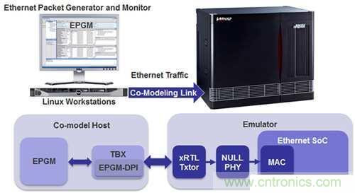 將這種設(shè)置與采用虛擬方法的設(shè)置進(jìn)行比較,如明導(dǎo)國際(Mentor Graphics)的虛擬乙太網(wǎng)設(shè)備(VirtuaLAB)。在此場景中,裝有Linux環(huán)境的工作站連接硬體加速器,在工作站上用軟體對乙太網(wǎng)測試儀實(shí)現(xiàn)一樣的行為模式。基于成熟的實(shí)現(xiàn)智慧財產(chǎn)權(quán)(IP),模型準(zhǔn)確再現(xiàn)了實(shí)際的物理測試儀。