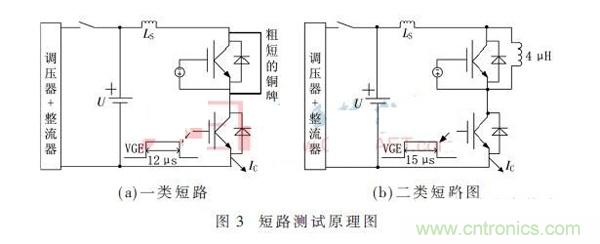 圖3(a)為一類短路測試原理圖,電網(wǎng)電壓經(jīng)過調(diào)壓器和整流橋,將母線電容電壓充到1 500 V,上管igbt的門極被-15 V關(guān)斷,且用粗短的銅排將其短路。對下管的IGBT釋放一個12 μs的單脈沖,直通就形成一類短路。圖3(b)為二類短路測試原理圖,將母線電容電壓同樣充到1 500 V,上管IGBT的門極被-15 V關(guān)斷,且給上管并聯(lián)一個4 μH的電感作為負載,下橋臂通過IGBT驅(qū)動器釋放一個15 μs的單脈沖就形成二類短路。