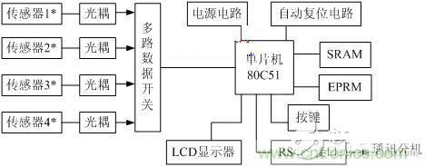 壓力測量控制系統(tǒng)的結(jié)構(gòu)如圖1所示, 它以80C51單片機(jī)為核心, 包括傳感器、光耦、多路數(shù)據(jù)開關(guān)、LCD液晶顯示器、SRAM, EPROM、自動復(fù)位電路、RS-485接口電路及高效電源電路等。下面分別介紹一下它們各自的設(shè)計特點。