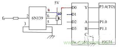 由圖2看出,傳感器頻率信號是通過光電耦合器6N139耦合到74HC151的輸入引腳D0。80C51的P1.0, P1.1輸出控制碼,選擇D0--D3輸入中的一路,用單片機(jī)的T0測信號頻率。
