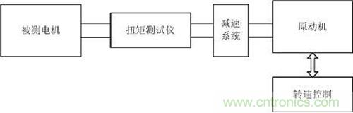 在國標(biāo)GBT/ 30549-2014里對(duì)齒槽轉(zhuǎn)矩的測(cè)試有了明確的定義:電機(jī)繞組開路時(shí),電機(jī)回轉(zhuǎn)一周內(nèi),由電樞鐵心開槽,有趨于最小磁阻位置的傾向而產(chǎn)生的周期性力矩。齒槽轉(zhuǎn)矩的測(cè)試方法常用的有:杠桿測(cè)量法、轉(zhuǎn)矩儀法。杠桿測(cè)量法比較簡(jiǎn)單,測(cè)量精度比較差,所以主要用于對(duì)精度要求不高的場(chǎng)合。轉(zhuǎn)矩儀法架構(gòu)圖如圖2所示,由于伺服電機(jī)的齒槽轉(zhuǎn)矩非常小,所以測(cè)試時(shí)需要以一個(gè)非常低的轉(zhuǎn)速來帶動(dòng)未上電的被測(cè)電機(jī)來完成測(cè)試,原動(dòng)機(jī)輸出后要先經(jīng)過減速系統(tǒng),將轉(zhuǎn)速降至1rpm/min左右,然后帶動(dòng)被測(cè)電機(jī)進(jìn)行測(cè)試,用扭矩