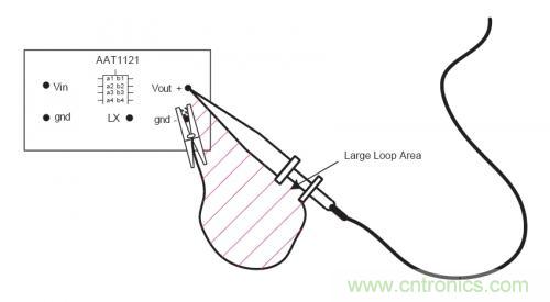 在測(cè)量中,如何減小拾取的輻射噪聲?最簡(jiǎn)單可靠的方法是采用一個(gè)接地環(huán)來測(cè)量電源紋波以及噪聲。為了進(jìn)一步的降低測(cè)試誤差,可以將示波器探頭和地線直接放在電源輸出電容得兩端。如下圖所示,采用這種方法,在信號(hào)探頭和地線之間的環(huán)路面積很小,所以測(cè)量中帶來誤差的噪聲幾乎可以忽略。