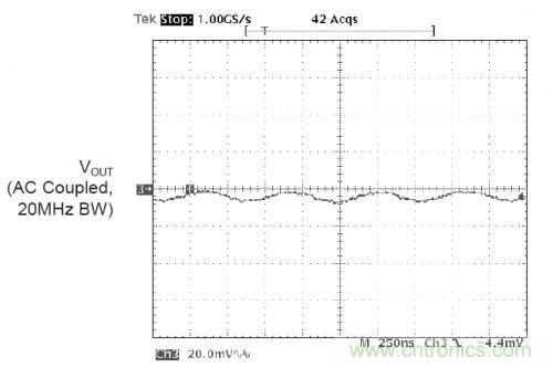 下圖是采用20MHz帶寬限制測(cè)試到的電源的紋波以及噪聲。示波器20MHz的帶寬限制是為了防止無源探頭帶入的共模噪聲??梢钥吹紸AT1121BUCK轉(zhuǎn)換器的紋波噪聲為10mVp-p,幾乎看不到開關(guān)噪聲。這主要是歸功于BUCK控制器的低噪聲設(shè)計(jì),良好的PCB設(shè)計(jì),以及恰當(dāng)?shù)臏y(cè)試方法。