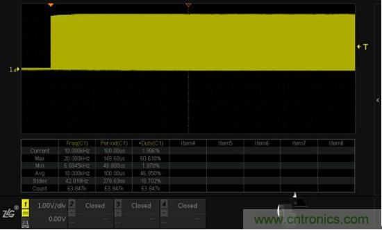 ZDS4000系列示波器不僅僅可以分析占空比趨勢,還可以分析周期和頻率變化趨勢,結(jié)合強(qiáng)大的測量功能。