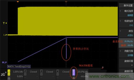 這個(gè)時(shí)候用ZDS4000系列示波器新開發(fā)獨(dú)特的占空比趨勢測量功能,將每一個(gè)PWM波的占空比顯示在屏幕上,點(diǎn)擊示波器數(shù)學(xué)運(yùn)算Math按鍵,模式選擇趨勢圖,類型選擇占空比,示波器會(huì)自動(dòng)檢測PWM波的周期和閾值,無需過多設(shè)置,就可以快速出波形,波形如圖5所示。屏幕上除了通道1,還多了MATH通道,顏色為紫色,MATH通道顯示的即是占空比趨勢,可以看到占空比緩慢遞增后大約在屏幕中間位置出現(xiàn)了異常。和通道1一樣,MATH通道也可以調(diào)節(jié)垂直檔位和偏移。