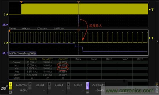 定位到占空比異常位置后,開啟示波器縮放模式下ZOOM多窗口顯示功能,對(duì)信號(hào)進(jìn)行局部放大,如圖6所示,可以清晰的看到占空比異常的細(xì)節(jié),同時(shí)開啟對(duì)ZOOM1窗口數(shù)據(jù)的測量和統(tǒng)計(jì),可以看到占空比從正常的59.62%變?yōu)?.99%左右。