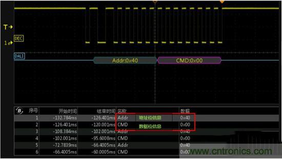 現(xiàn)場模擬照明控制DALI通信協(xié)議,這里用數(shù)據(jù)挖掘型示波器ZDS4054 Plus為例,其免費標(biāo)配DALI協(xié)議解碼功能,可對全內(nèi)存512Mpts的數(shù)據(jù)進(jìn)行解碼,且可對照明控制器與鎮(zhèn)流器之間的信號監(jiān)測,取其中一幀數(shù)據(jù)的信息在事件表中進(jìn)行查看,如下圖6所示: