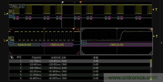 對長時間監(jiān)測的數(shù)據(jù)進(jìn)行異常分析,可在示波器的縮放模式下使用雙ZOOM多窗口顯示的功能,對信號進(jìn)行多窗口異常監(jiān)測和分析,可同時對任一數(shù)據(jù)幀和數(shù)椐幀上升沿或下降沿細(xì)節(jié)進(jìn)行分析,然后通過查看放大數(shù)椐細(xì)節(jié),事件表中的數(shù)據(jù)和波形一一對應(yīng),定位異常非常方便,如下圖7所示。