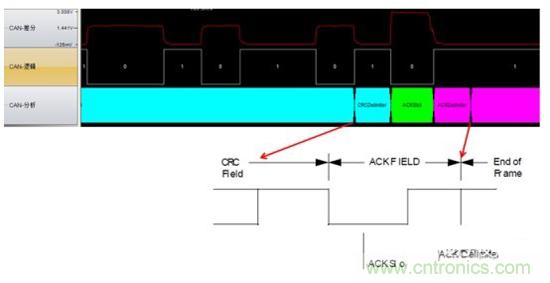 當(dāng)一個接收節(jié)點(diǎn)接收的幀起始到CRC段之間的內(nèi)容沒發(fā)生錯誤時,它將在ACK段發(fā)送一個顯性電平。 如圖3所示: