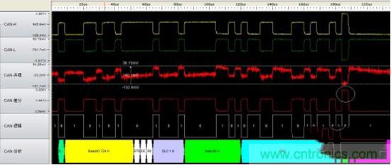 【導(dǎo)讀】CAN總線一直以實(shí)時性強(qiáng)、傳輸距離遠(yuǎn)、抗干擾能力強(qiáng)、數(shù)據(jù)保證到達(dá)等特點(diǎn)而廣泛應(yīng)用于高可靠性的場合。但常常在觀察CAN通信波形時,我們會發(fā)現(xiàn)差分電平在ACK段突然增高,這是什么原因?qū)е碌哪??這里結(jié)合測試實(shí)例對ACK電平偏高的原因做簡單分析。