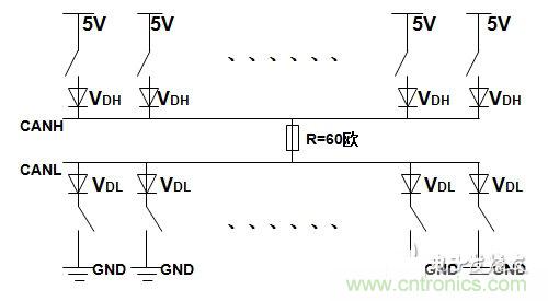按照標(biāo)準(zhǔn),在總線輸出為顯性時,CANH=3.5V,CANL=1.5V,差分分電平:CANH-CANL=2V,總線網(wǎng)絡(luò)電阻為60歐,流經(jīng)終端電阻的電流約為33mA(2V/60歐);