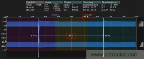 采樣點:采樣點不能太靠前也不能太靠后,否則如果剛好處于一個位的上升沿或者下降沿區(qū)間,會造成識別錯誤,所以根據(jù)CIA105的規(guī)范,采樣點在87.5%左右比較合適。但是一般我們可根據(jù)實際情況選取75%~85%之間;