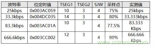 同步跳轉寬度(SJW):SJW的值直接影響到重同步時相位緩沖段的可調節(jié)的范圍,SJW的值可以在1~4之間選擇,我們選擇3、4可以使總線獲得更寬的波特率容忍度;