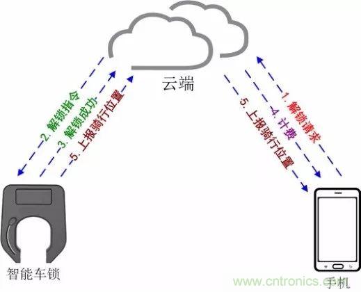 1.手機(jī)先掃單車上二維碼,而后向云端發(fā)起解鎖請求(請求中會攜帶掃碼單車的ID信息及用戶個人賬號信息)。云端對用戶信息、單車信息進(jìn)行核查,而后將授權(quán)信息發(fā)送給手機(jī)。(步驟1、2)
