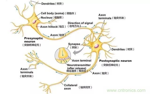 人腦神經(jīng)元在接受到刺激后,其細胞膜內(nèi)外帶電離子分布將發(fā)生變化,因而形成電位差,電位差將沿著神經(jīng)細胞軸突、樹突雙向傳導,形成脈沖電流。而當該電信號傳遞到突觸時,突觸前神經(jīng)元將釋放神經(jīng)遞質(zhì)(如多巴胺、腎上腺素)由突觸后神經(jīng)元接受神經(jīng)遞質(zhì)產(chǎn)生興奮(該過程單向傳遞),并向下傳遞作用與人體反應器并發(fā)生反應。