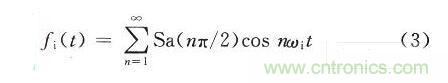 首先對(duì)量化過(guò)程進(jìn)行分析,現(xiàn)假設(shè)基帶輸入信號(hào)為一個(gè)正弦信號(hào)gi(t)=Esinωit,量化位數(shù)為N,經(jīng)過(guò)量化后的信號(hào)可用階梯波y(t)表示,y(t)可以被認(rèn)為是N對(duì)矩形波的疊加。如果A/D變換的量化位數(shù)為m,那么正或負(fù)半周的量化臺(tái)階數(shù)為N=2m-1。階梯波的表達(dá)式為: