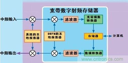 數(shù)字射頻存儲(chǔ)(DRFM)的基本工作原理:首先將輸入射頻信號(hào)下變頻為中頻信號(hào),經(jīng)A/D變換后成為數(shù)字信號(hào),寫(xiě)入高速存儲(chǔ)器中。當(dāng)需要重發(fā)這一信號(hào)時(shí),在控制器控制下讀出此數(shù)字信號(hào)并由D/A變換為模擬信號(hào)。然后用同一本振作上變頻,得到射頻輸出信號(hào),完成對(duì)輸人信號(hào)的存儲(chǔ)轉(zhuǎn)發(fā)。