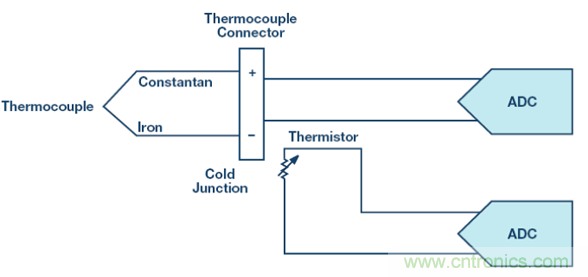 使容性 PGA 性能與阻性 PGA 相當(dāng)?shù)目尚修k法是以更高的電源電壓對(duì)電橋供電。比如,以±3.3 V 雙極性電源對(duì)電橋供電,從而增加應(yīng)變計(jì)的靈敏度,但代價(jià)是更高的系統(tǒng)復(fù)雜性和功耗??赡軙?huì)得益于容性 PGA 的另一個(gè)例子是采用電阻式溫度檢測(cè)器(RTD)或熱電偶的溫度測(cè)量應(yīng)用。常用 RTD 電阻(比如 PT100)可以用來直接檢測(cè)溫度,或間接檢測(cè)熱電偶的冷結(jié),如圖 9 所示。