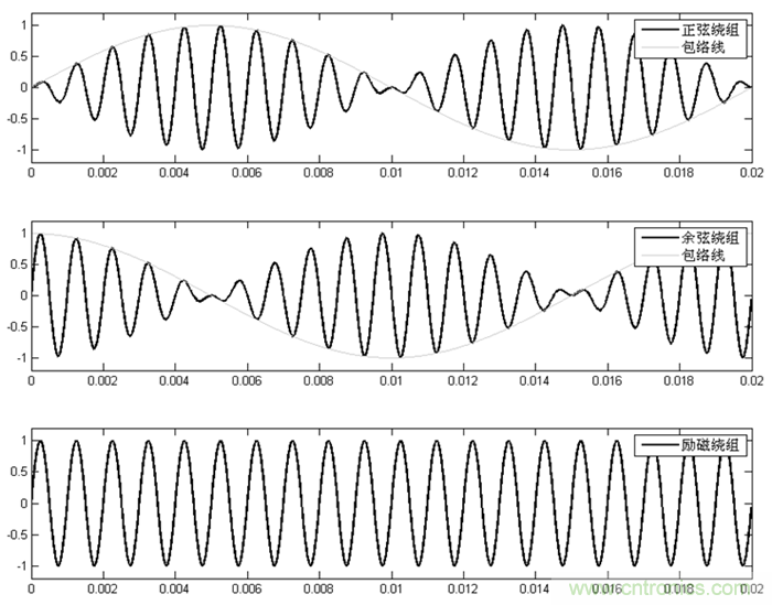 正弦繞組和余弦繞組輸出為調(diào)幅波,其包絡(luò)線分別為正弦波和余弦波,包絡(luò)線的頻率為50Hz,對應(yīng)轉(zhuǎn)子的轉(zhuǎn)速,正弦繞組和余弦繞組的幅值的比值的反正切就是轉(zhuǎn)子的轉(zhuǎn)角。