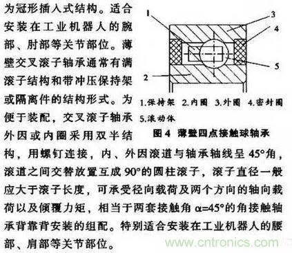 球軸承是機器人和機械手機構中最常用的軸承。它能承受徑向和軸向載荷,摩擦較小。其機器人專用軸承四點接觸式設計以及高精度加工。這種軸承比同等軸徑的常規(guī)中系列四點接觸軸承輕25倍。它的內圈(或外圈)由兩個半圈精確拼配而成,而其整體外圍(或內圈) 的溝曲率半徑較小,使鋼球與內、外圈在四個“點”上接觸。既加大了徑向負荷能力,又能以緊湊的尺寸承受很的兩個方向的軸向負荷,并且有很好的兩個方向的軸向限位能力,因為它的軸向游隙相對較小。而其接觸角 (一般取為35)又較大。工業(yè)機器人專用薄壁四點接觸球軸承通常有帶密封圈和不帶密封圈的結構形式(見圖4)。其主要由內圈、外 圍、保持架、鋼球或非接觸式密封圈組成。內、外圈均為整體結構。鋼球與內、外因溝道呈四點接觸.保持架為冠形插入式結構。