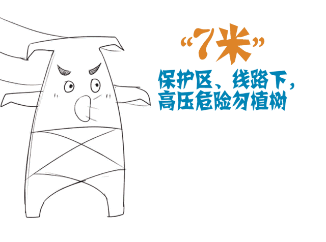 1、“7米”——保護(hù)區(qū)、線路下 ,高壓危險(xiǎn)勿植樹(shù)