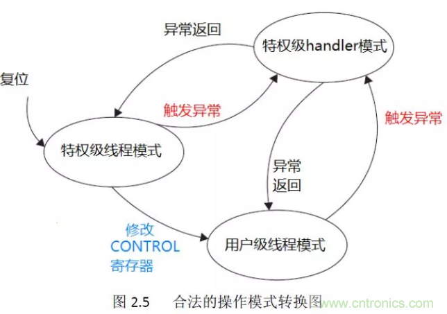 處理器也有兩種特權(quán)分級(jí):特權(quán)級(jí)和用戶級(jí)。 這張圖說明了一切:復(fù)位進(jìn)入特權(quán)級(jí)線程模式,如果有異常,進(jìn)入特權(quán)級(jí)的handler模式處理異?;蛑袛嗬蹋缓蠓祷刂撂貦?quán)級(jí)線程模式。通過修改CONTROL寄存器可以進(jìn)入用戶級(jí)線程模式。