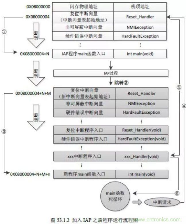 后面的過程和STM32正常運(yùn)行一樣,如果出現(xiàn)中斷請(qǐng)求,還是跳轉(zhuǎn)到A區(qū)域中的中斷向量表中,然后再跳轉(zhuǎn)到B區(qū)域的中斷服務(wù)入口。