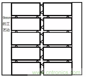 工藝邊用于在自動(dòng)化貼片時(shí),貼片機(jī)需要夾住板子的邊緣進(jìn)行貼片,通常只需要加兩邊即可。工藝邊寬度的選擇通常比較寬泛,可以選常用的9mm。注意工藝邊只是在貼片生產(chǎn)時(shí)用到,在元件組裝完后就可以掰掉的。開發(fā)人員在畫板子的時(shí)候不需要把工藝邊給畫上去,但是需要在發(fā)給廠家的文件中需要注明。工藝邊如下圖所示:
