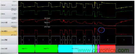 圖6波特率異常(位寬度從2us突然變成1.6us),導致位錯誤引起錯誤幀。位寬的不穩(wěn)定是波特率不穩(wěn)定導致的,最有可能的原因是晶振問題,建議更換晶振測試。