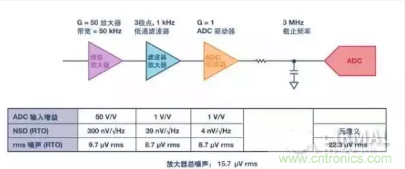 圖1顯示了過采樣系統(tǒng)中的情況。從噪聲頻譜密度看,系統(tǒng)總噪聲似乎以增益放大器為主,但一旦考慮帶寬,各級貢獻的rms噪聲其實非常相近。