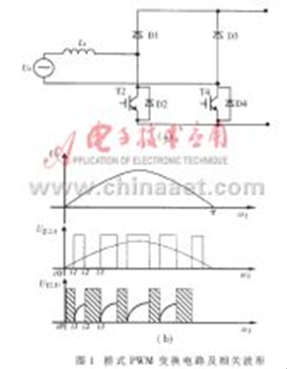 圖1(a)所示為工作在PWM整流狀態(tài)的H型橋式PWM變換電路(此圖為正弦波正半波輸入下的等效電路,上半橋的兩只IGBT未畫(huà)出),圖1(b)為下半橋兩只大功率器件的驅(qū)動(dòng)信號(hào)和相關(guān)的器件波形?,F(xiàn)以正半波工作過(guò)程為例進(jìn)行分析(對(duì)于三相PWM電路,在整流、逆變工作狀態(tài)或單相DC/DC工作狀態(tài)下,PWM電路的分析過(guò)程及結(jié)論基本類(lèi)似)。