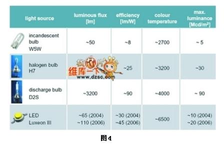 目前使用于車上的燈源可區(qū)分為白熾燈泡、鹵素燈泡、氣體放電式燈泡與LED光源,其比較如圖4所示。