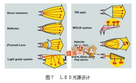光學設(shè)計時先考慮法規(guī)需求,討論視角與強度關(guān)系,以近燈為例須針對其特殊的15度揚角設(shè)計,如圖5所示。在傳統(tǒng)的燈具設(shè)計上由先期的利用反射罩配合透鏡刻紋作角度與強度的控制,演變成為利用反射罩直接控制強度角度,也發(fā)展出利用成像方式的魚眼透鏡設(shè)計法。不論何種的設(shè)計方式都須先考慮選用光源的特性,特別是角度與強度的光型輸出(Beam?。穑幔簦簦澹颍睿?,對傳統(tǒng)的光源而言,大多為柱狀光源,可產(chǎn)生類似蝴蝶外型的光型輸出,進而發(fā)展出來與之搭配的透鏡、反射罩、擋板、透鏡等光學組件。而利用LED作為光源設(shè)計燈具時,需重新考慮其光學特性由傳統(tǒng)的柱狀光源變?yōu)槠矫婀庠矗ú煌姆庋b設(shè)計有不同的光型輸出),進而搭配外部的光學組件而產(chǎn)生不同組合以應(yīng)用于不同產(chǎn)品,依照德國車燈大廠HELLA的設(shè)計分類,可將光源分為八大類,如圖6 所示。LED目前的單位面積發(fā)光量尚不及鹵素燈泡與放電式燈泡,想得到相同的流明輸出,LED需要較大的封裝面積。隨著光源輸出面積的增加,光學設(shè)計的難度也隨之提升,所以在現(xiàn)有的概念車上,都以模塊化光學設(shè)計取代既有的單一燈室設(shè)計,利用多組燈源達到傳統(tǒng)燈具的照明水平,除了降低光學設(shè)計的難度,也增加車體造型的設(shè)計感。